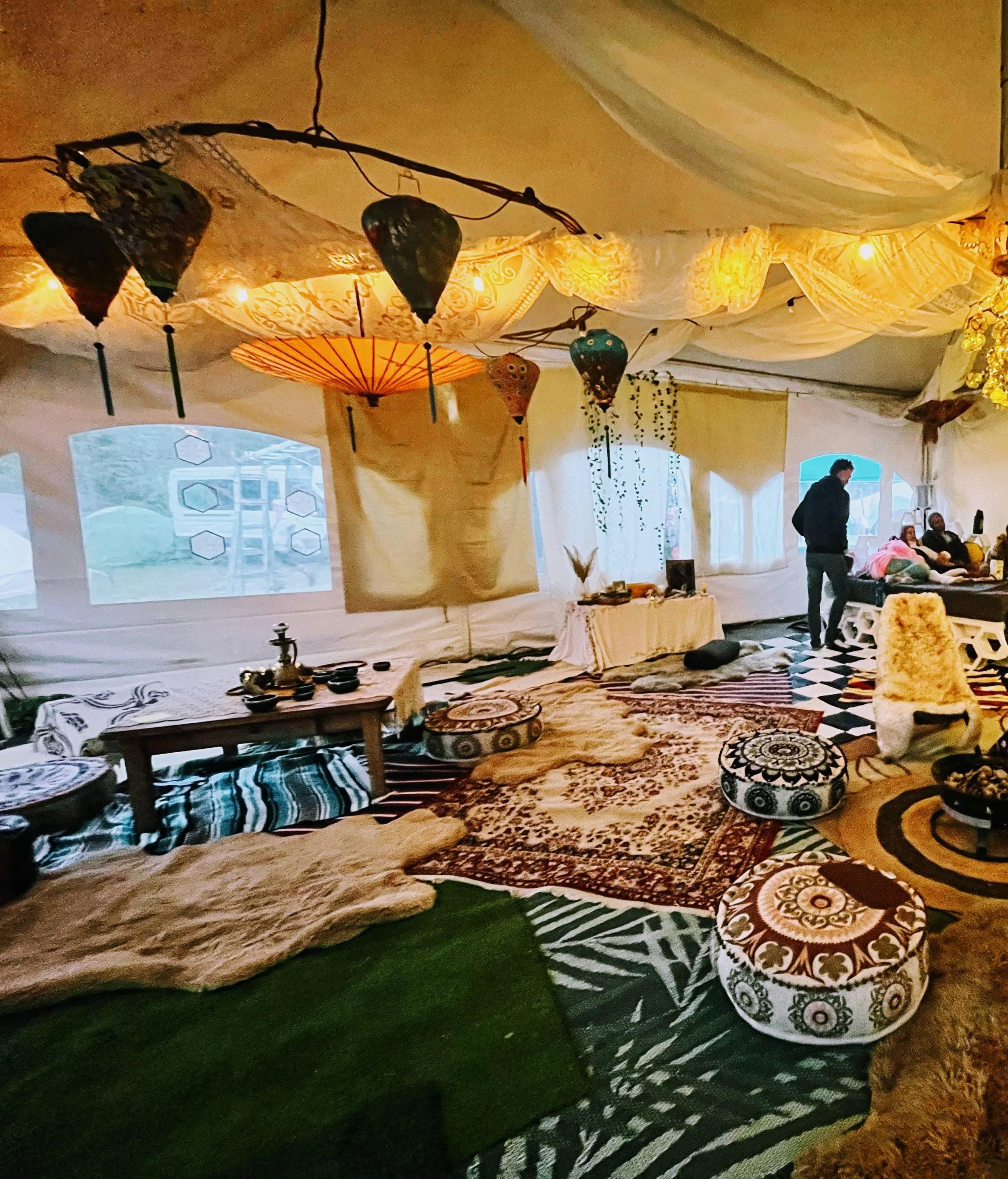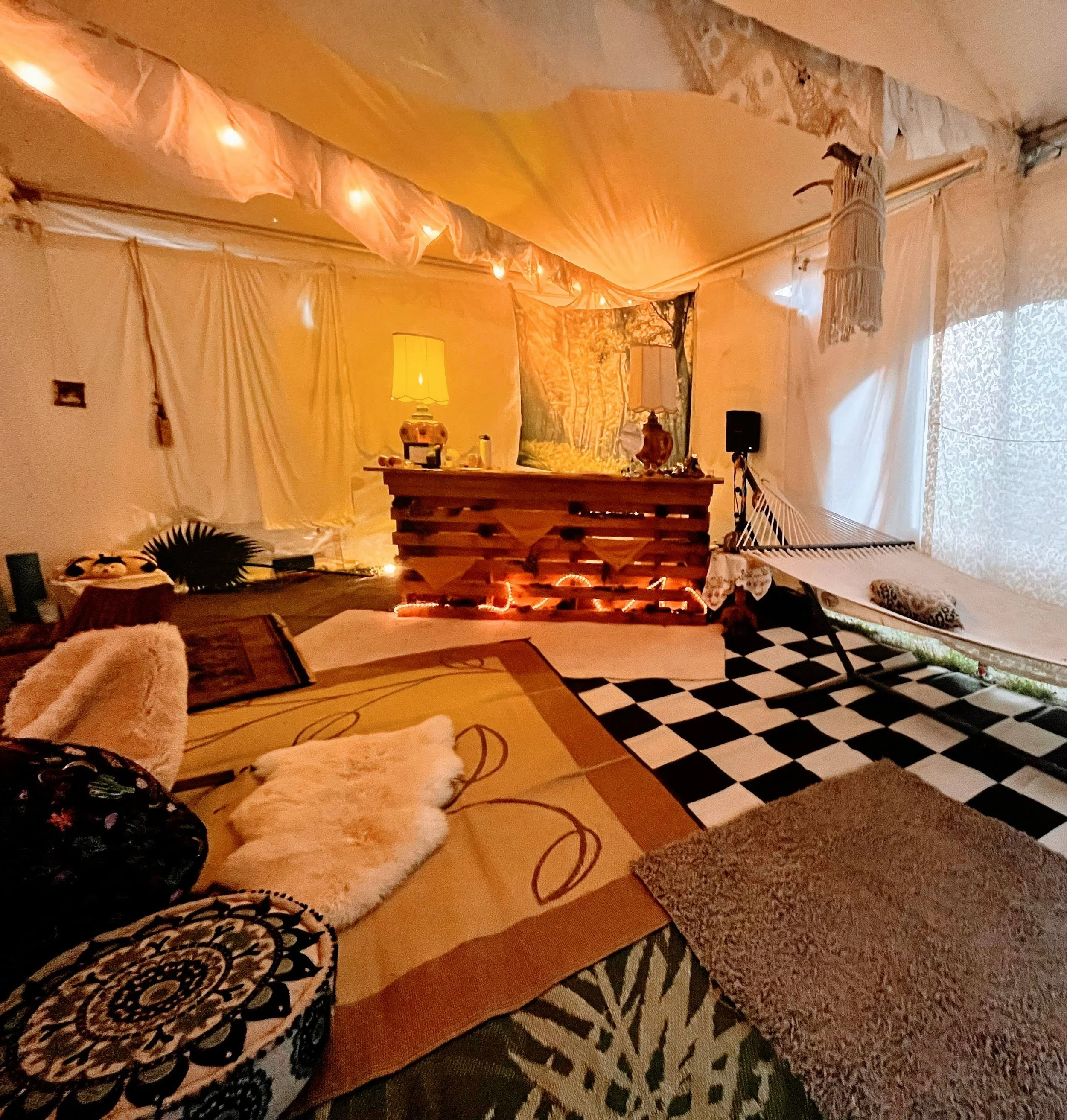 Picture a luxurious Utopic Fairyland sanctuary, dripping with honeycomb, lace, and wisteria. A king-sized bed, cozy cushions, and a mocktail elixir bar, where we serve up delicious homemade Oxymel mocktails and platters of fruit. Workshops at our camp include Worship 101, Platonic Sensuality, and Embodiment offerings. We have a well rounded team of innovative creatives who bring their talents and human-power to help make it happen.