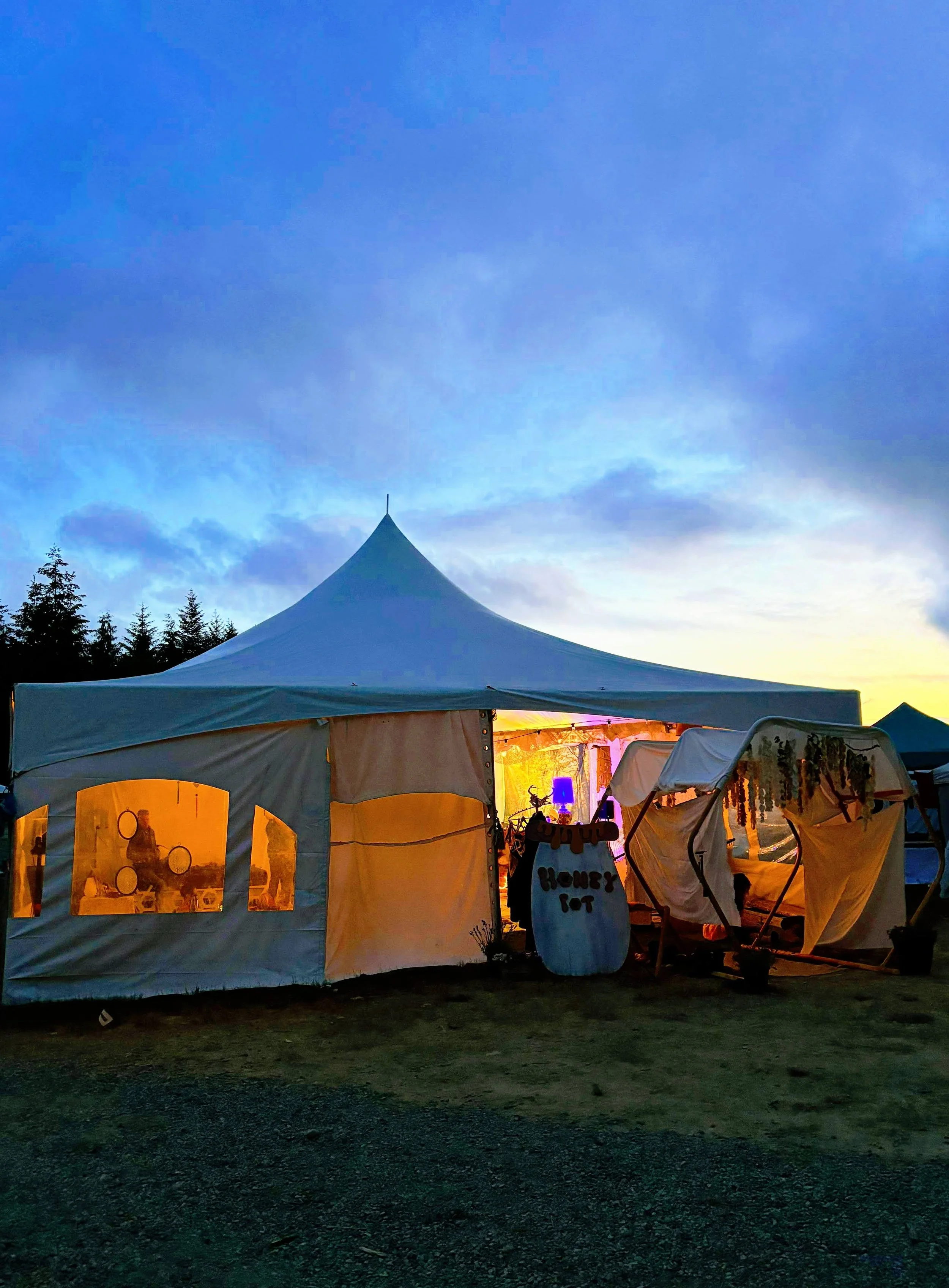 Fundraising for the Honey Pot helps us with the cost of our tent, buying materials (gas to power the generator for lights, fruit, lumber for the bed and bar, and materials for our crafted decor). We hosted a party on Forbidden Plateau on Saturday, May 11 2024 which helped us to achieve our financial goals. We had amazing local DJs and musicians, family activities (lawn games, hula hoops), a potluck, mini artisan market, cocktail and mocktail bar, bonfire, and on-site camping. Sunday morning included an all-levels yoga class in the morning, led by Yours Truly.