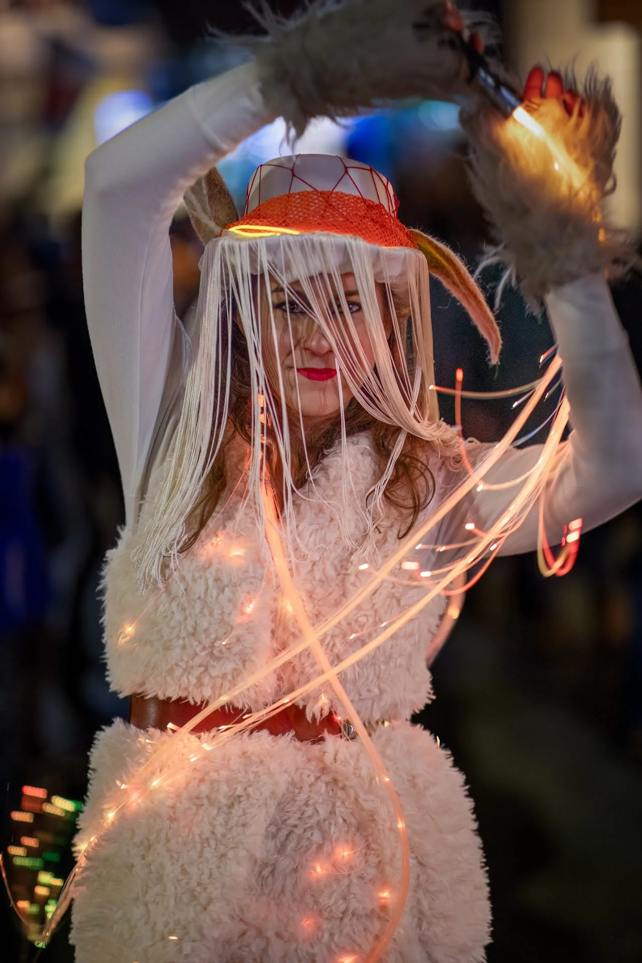 In addition to the exquisite choreographed performances, we also get to dance in parades, and flow freely through crowds in character during events. During the day, we may engage the audience with various props and toys, or let our characters do the work. In the dark, we bring out our LED flow toys and showcase our individuality.